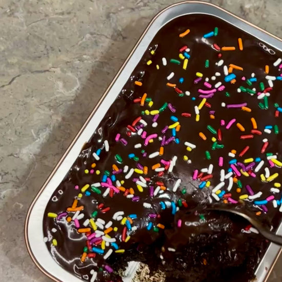 Get ready for our super moist chocolate cake! It's covered in a rich, smooth chocolate ganache and finished with colorful sprinkles. Pure chocolate happiness in every bite!