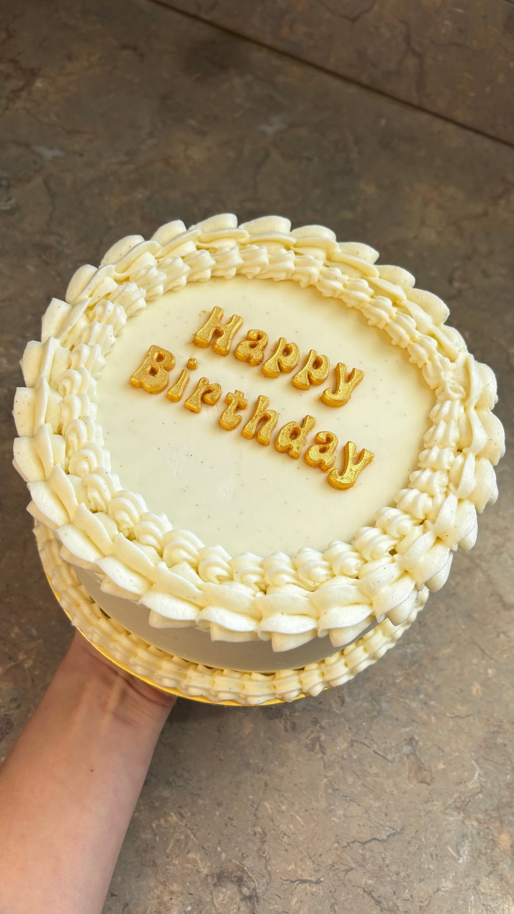 Vanilla-Moist vanilla cake, layered with vanilla cream. Frosted with vanilla buttercream.