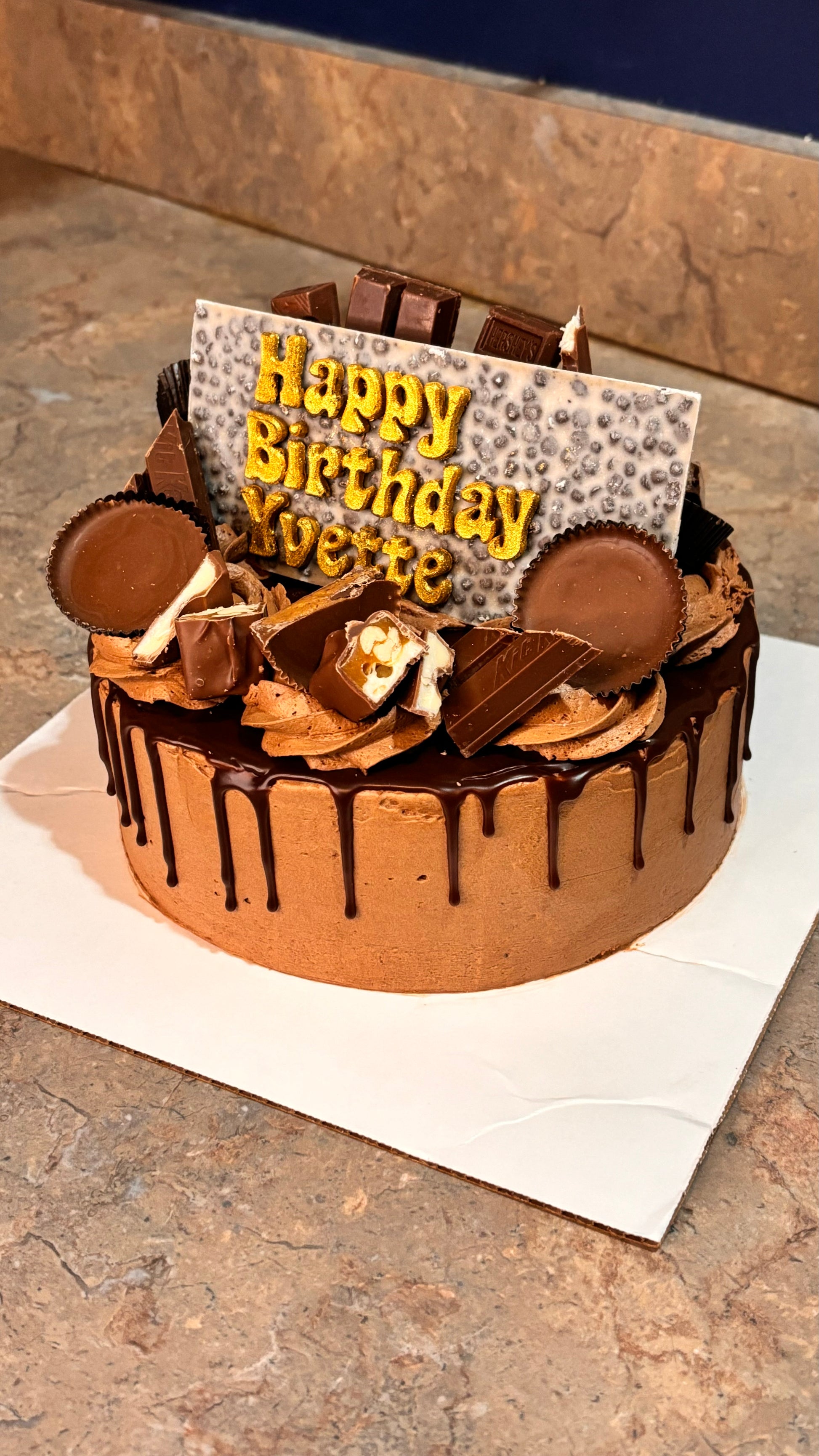 Chocolate party- Moist chocolate cake, layered with chocolate cream. Chocolate buttercream frosting, chocolate ganache drips and a party of chocolate candy on top.